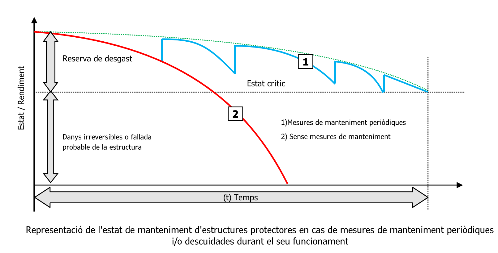 Les mesures de manteniment s'estableixen quan s'arriba a un estat crític per a la funcionalitat de les estructures. La reserva de desgast s'aprofita al màxim.